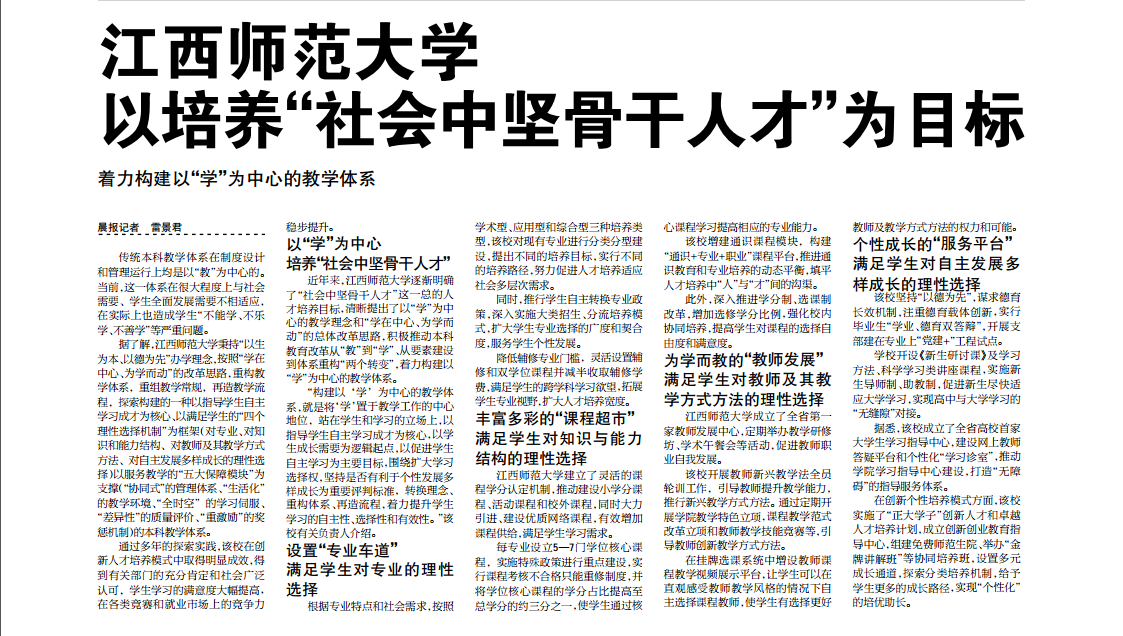 据了解,江西师范大学秉持“以生为本、以德为先”办学理念,按照“学在中心、为学而动”的改革思路,重构教学体系,重组教学常规,再造教学流程,探索构建的一种以指导学生自主学习成才为核心、以满足学生的“四个理性选择机制”为框架(对专业、对知识和能力结构、对教师及其教学方式方法、对自主发展多样成长的理性选择)以服务教学的“五大保障模块”为支撑(“协同式”的管理体系、“生活化”的教学环境、“全时空”的学习伺服、“差异性”的质量评价、“重激励”的奖惩机制)的本科教学体系。。